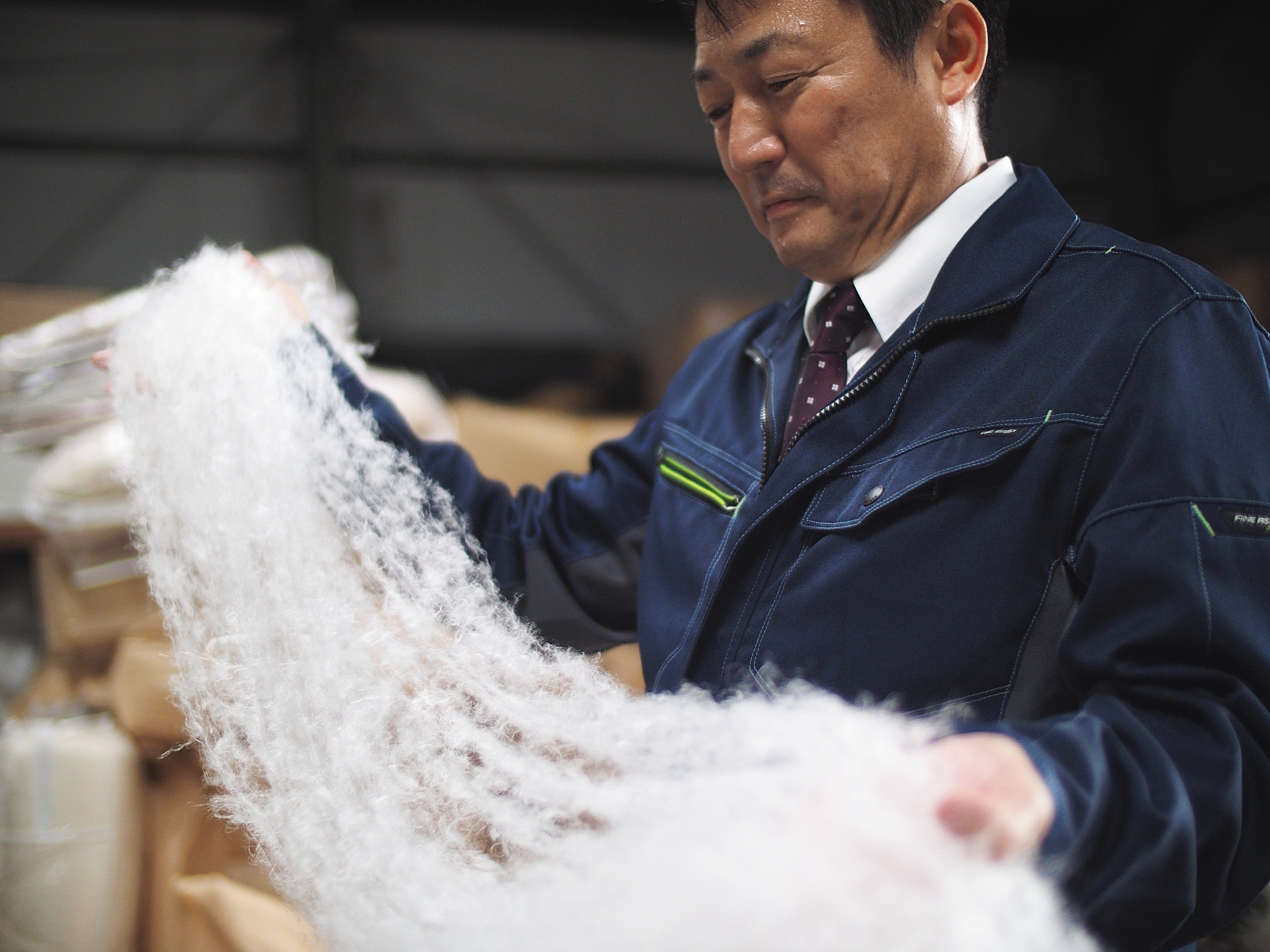 そんな危機感から、オール日本製の新しい素材「人工羽毛(ハイブリッドファイバース)」の開発を決断。